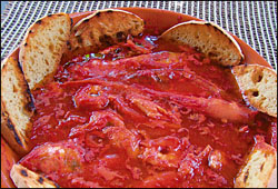 SASTOJCI: 1,5 kg mešane morske ribe po izboru (oslić, iverak, cipal, škrpina, barbuni, lignje), 12 gambora ili kozica, 500 g isečenog oljuštenog paradajza, 2 crvena luka, 1 rebro zelenog celera, 1 šargarepa, 2 veze peršuna, 100 ml suvog belog vina, malo mlevene ljute papričice, so, biber